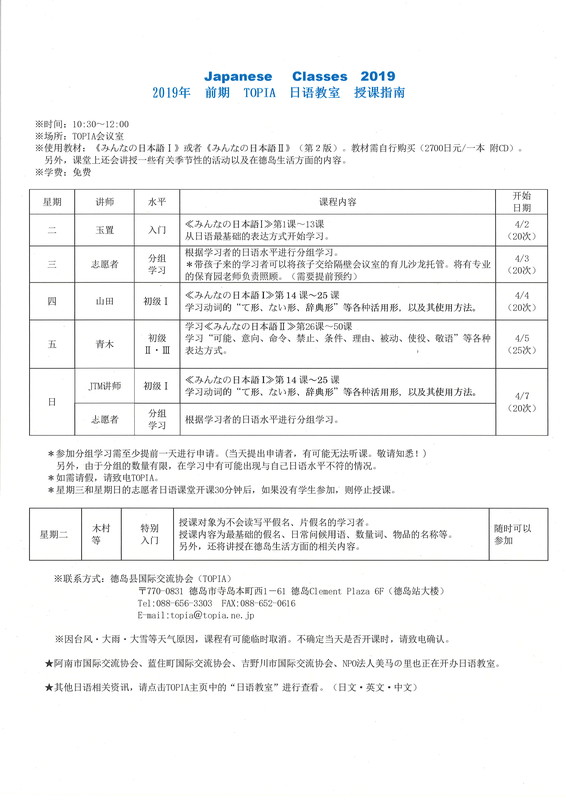 2019年上学期日语教室的课程安排说明 (在TOPIA上课部分)