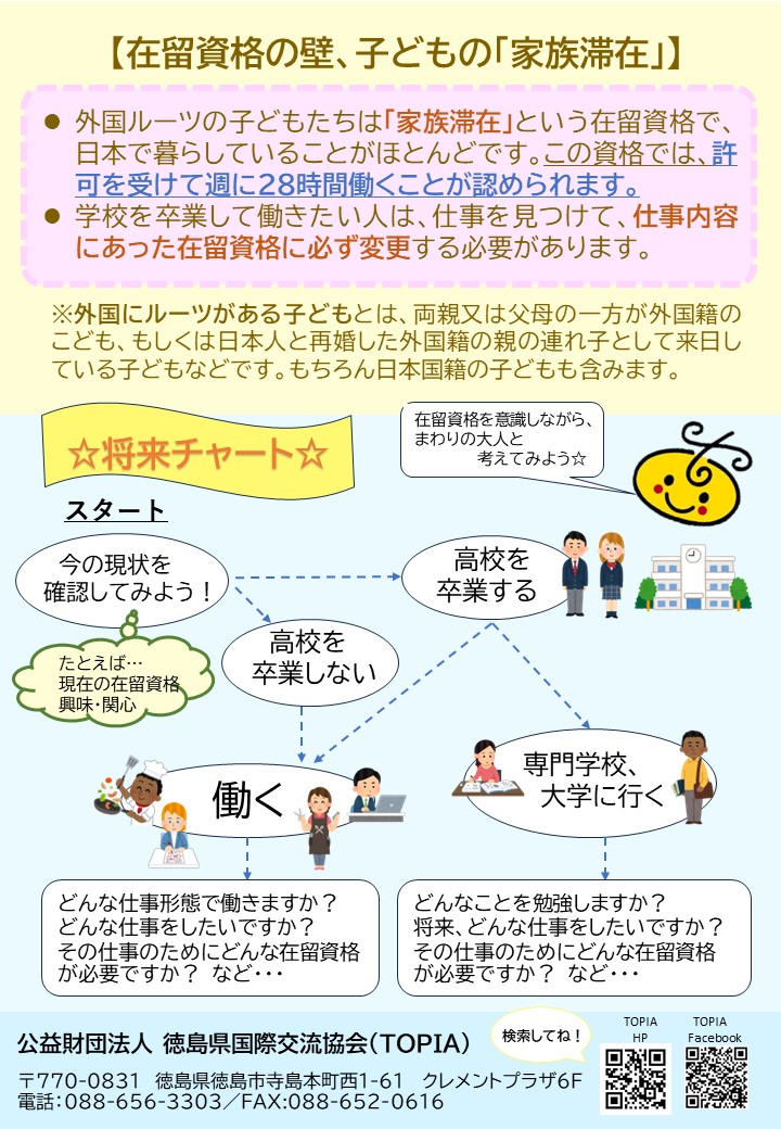 公開日 2024.05.09 外国人在日本生活,需要有“在留资格”。 所以,您在选择升学,就职之时,需要考虑将来的在留资格。 为了让在异国他乡扎根的孩子在未来过上美好的生活, TOPIA与相关部门合作,为大家提供升学就职的咨询服务。 如果您有任何疑问,任何咨询,请联系我们。 進路TOPIAチラシ_最終版240415[PDF:579KB]
