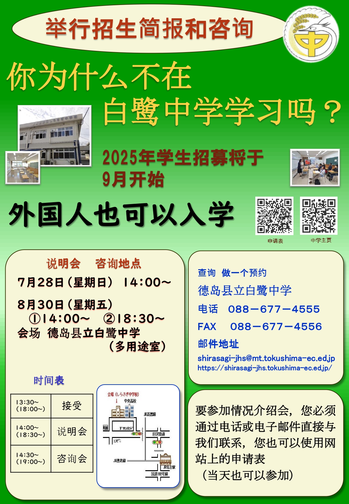 公開日 2024.07.18 白鹭中学从9月开始在招募2025年入学的学生 报名网页 https://shirasagi-jhs.tokushima-ec.ed.jp/page_20200605041924 白鹭中学的网站 https://shirasagi-jhs.tokushima-ec.ed.jp/