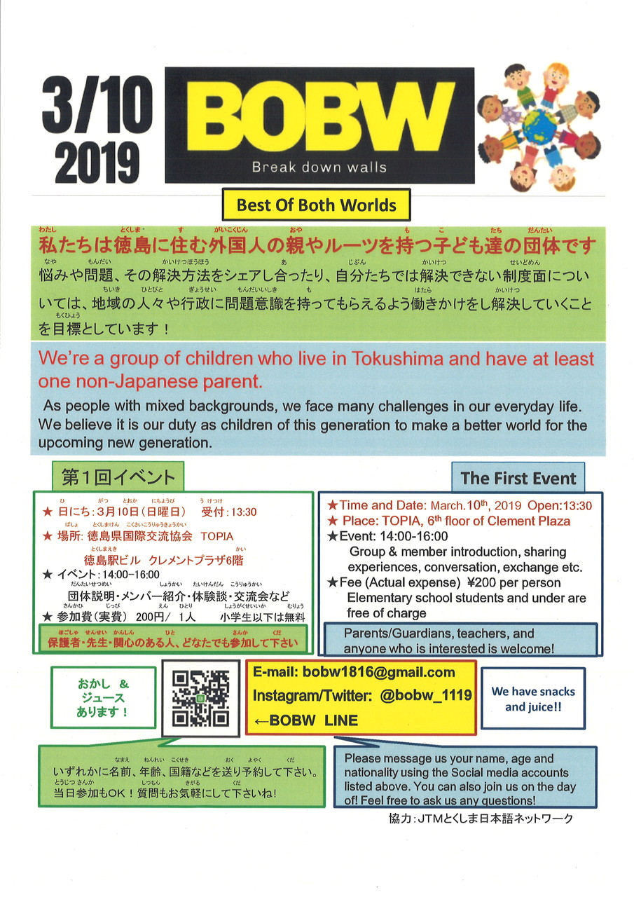 私(わたし)たちは徳島(とくしま)に住(す)む外国人(がいこくじん)の親(おや)やルーツを持(も)つ子(こ)ども達(たち)の団体(だんたい)です。一緒(いっしょ)に交(こう)流(りゅう)しましょう!