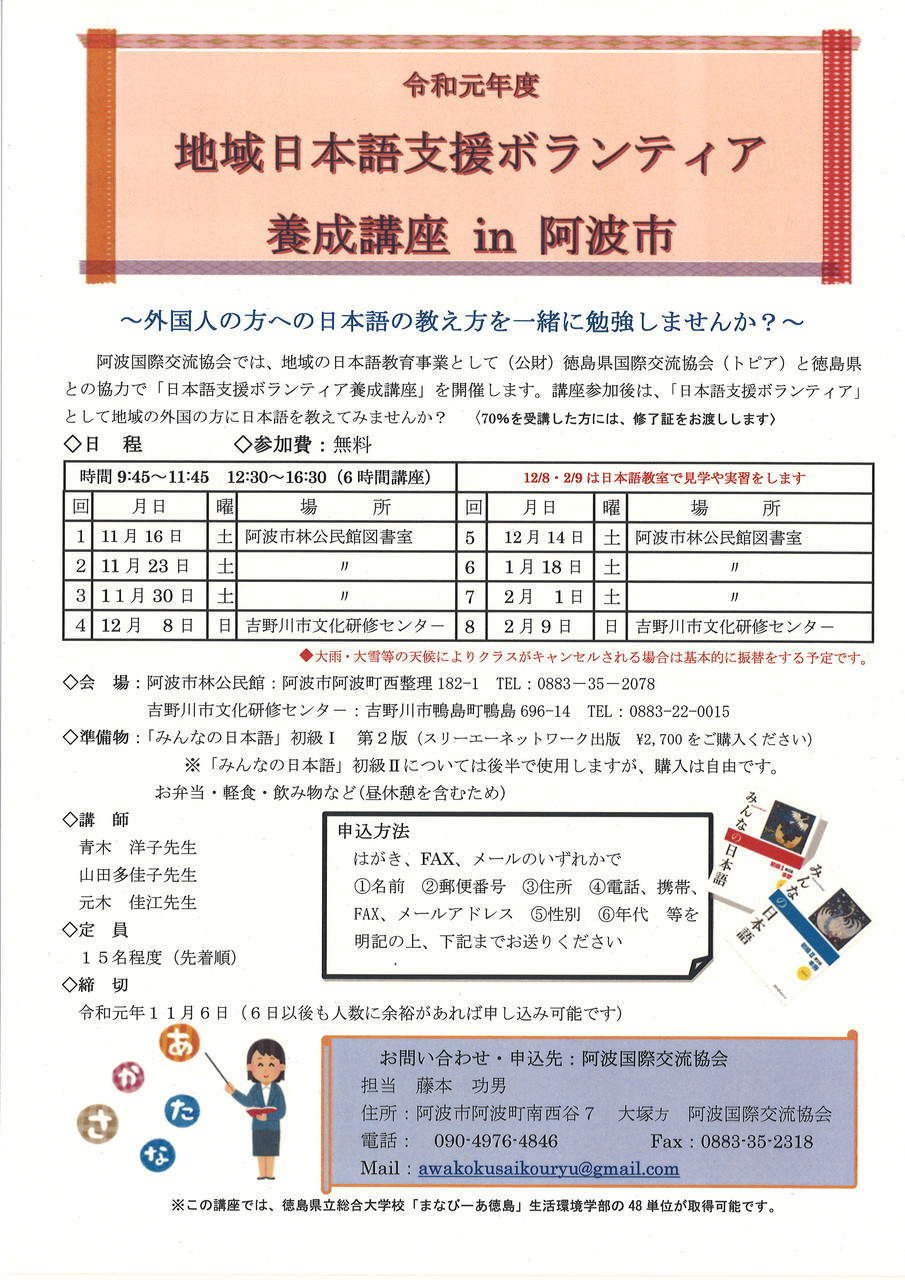 公開日 2019年11月05日 更新日 2019年11月05日 お問い合わせ 国際戦略センターTEL:088-656-3303FAX:088-652-0616E-Mail:topia@topia.ne.jp