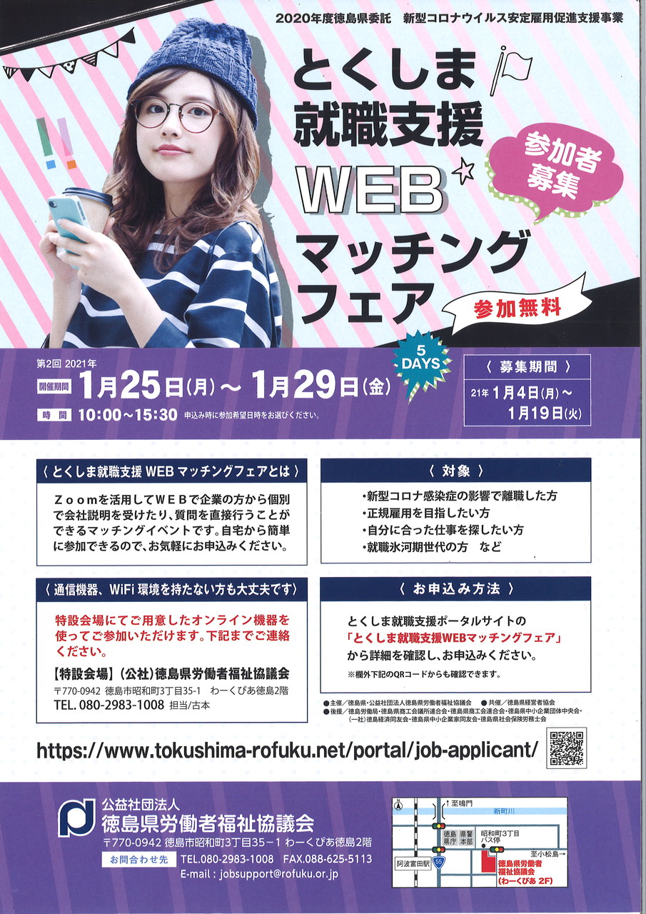 公開日 2021年01月13日 更新日 2021年01月13日 日付(ひづけ) : 2021年(ねん) 1月(がつ)25日(にち) (火(か) )~ 1月(がつ)29日(にち) (金(きん)) 時間(じかん) : 10:00~15:30 場所(ばしょ) : わーくぴあ徳島(とくしま)2階(かい) (〒770-0942 徳島(とくしま)市(し)昭和(しょうわ)町(ちょう)3 丁(ちょう)目(め)35-1)