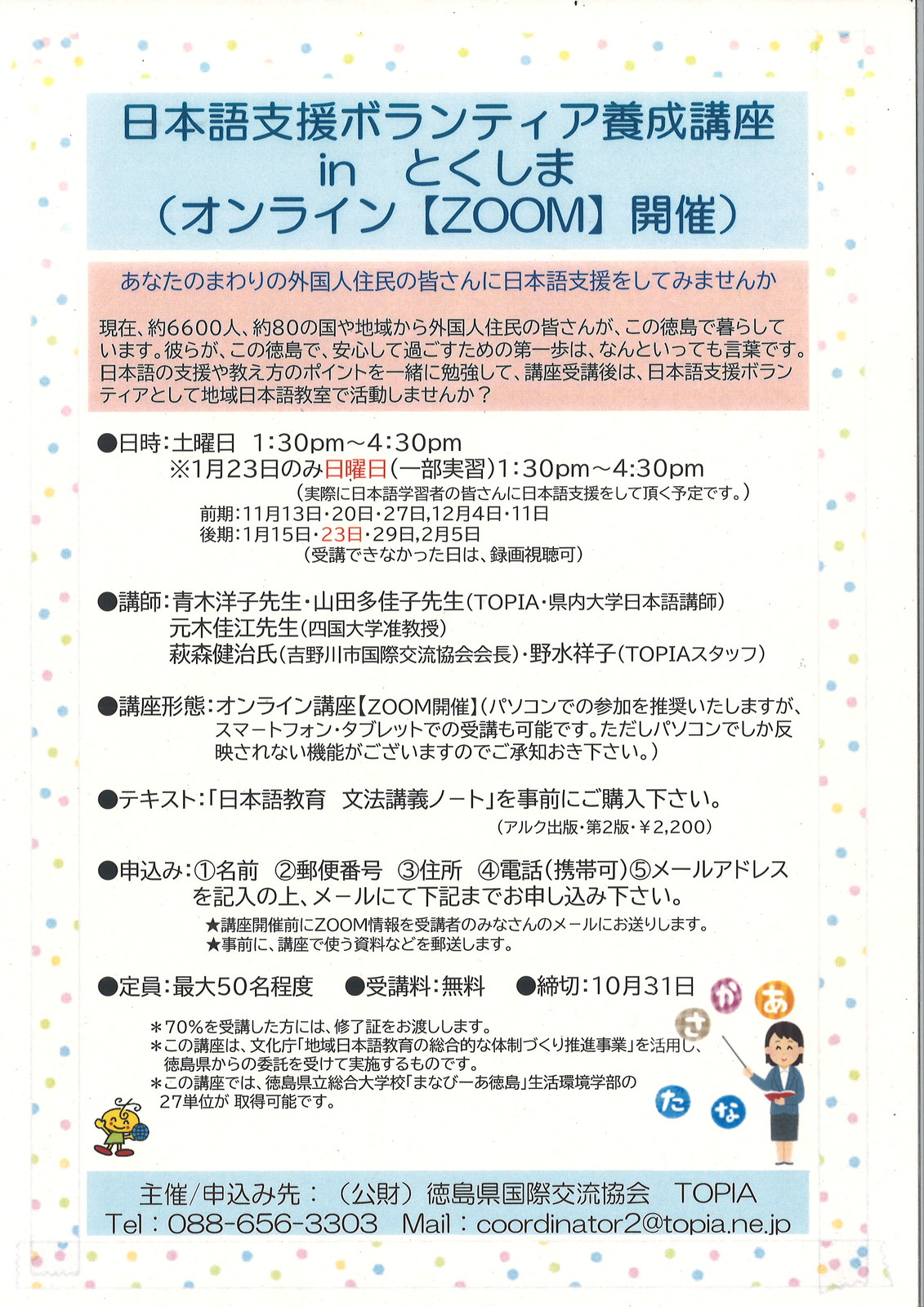 日本語支援ボランティア養成講座 in とくしま(オンライン【ZOOM】開催)