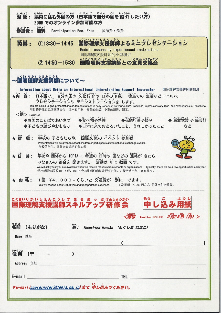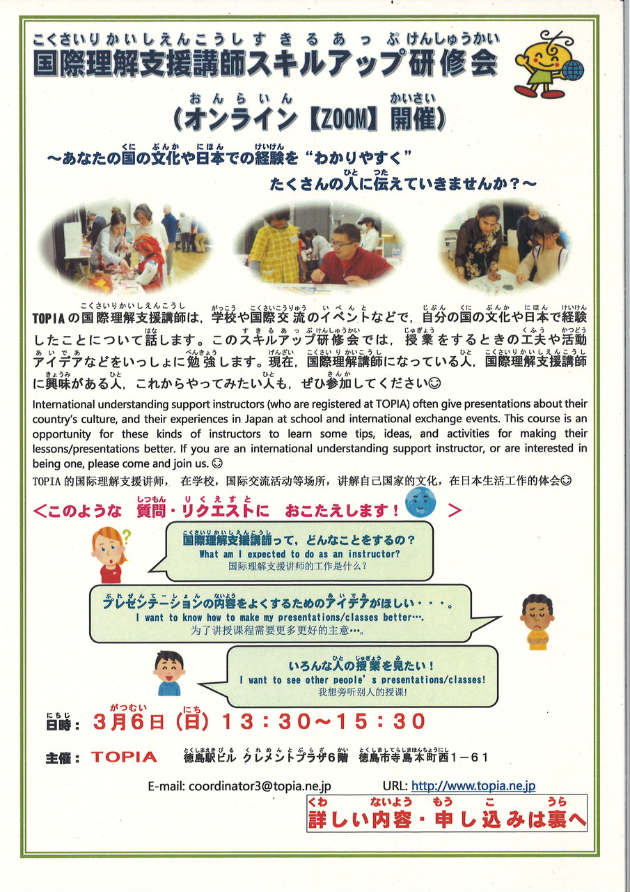 公開日 2022年02月02日 更新日 2022年02月02日 国際理解支援講師スキルアップ研修会➀[PDF:1.89MB] 国際理解支援講師スキルアップ研修会② 申し込み用紙[PDF:127KB] お問い合わせ 国際戦略センターTEL:088-656-3303FAX:088-652-0616E-Mail:topia@topia.ne.jp