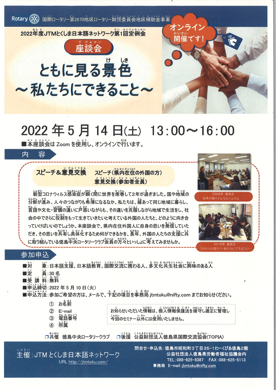 公開日 2022年05月06日 更新日 2022年05月06日 対象:日本語支援、日本語教育、国際交流に携わる人、多文化共生社会に興味のある人 定員:30名 受講料:無料 申込締め切り:2022年5月10日(火)