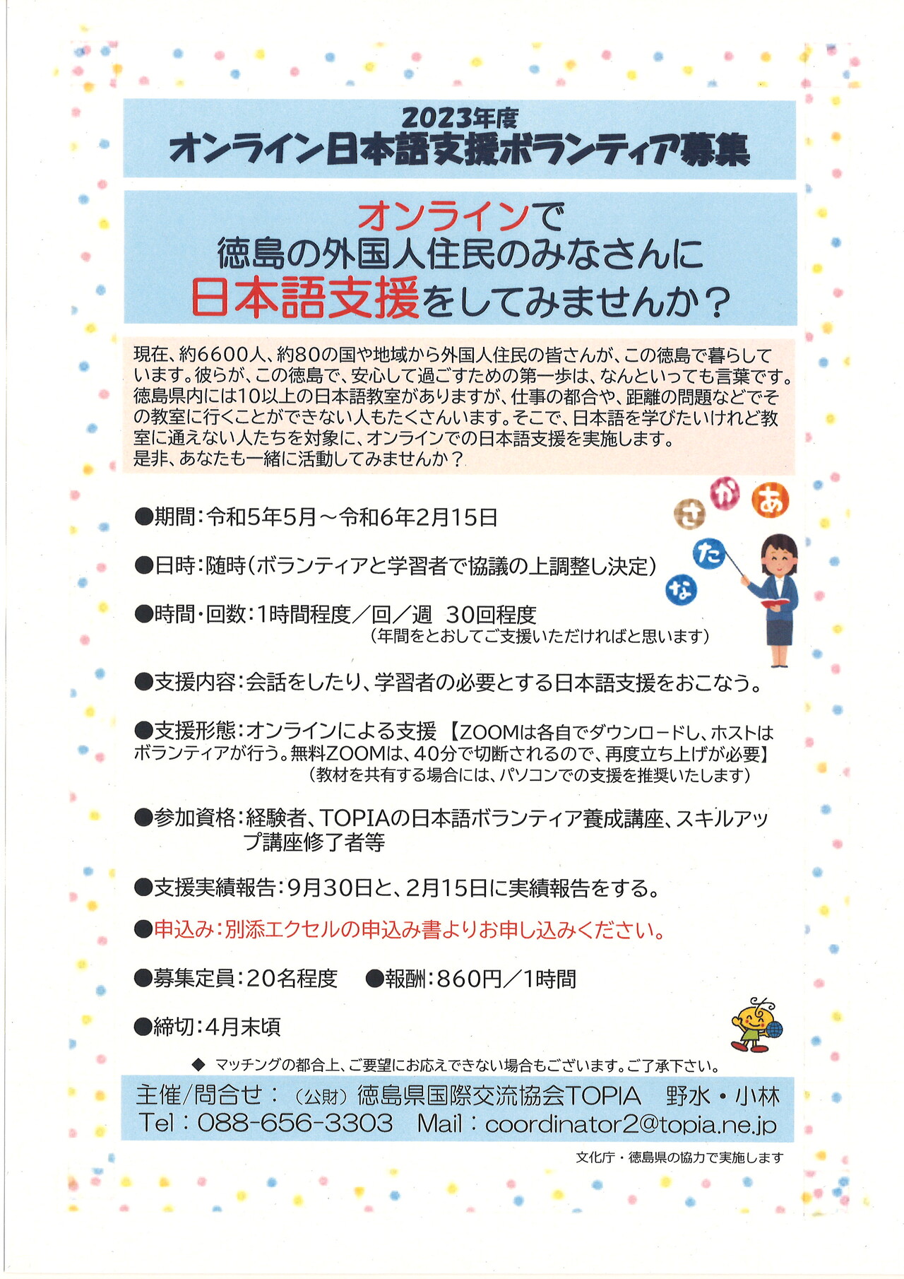 公開日 2023年04月12日 今年度もオンライン日本語支援ボランティア募集しております。 参加希望の方は、以下のEXCELファイルに詳細を入力後、チラシにありますメールアドレスまでファイルをお送り下さい。 ご応募お待ちしております! 日本人ボランティア募集ちらし[PDF:275KB] 日本語ボランティアZOOM支援申込書[XLSX:18.1KB]