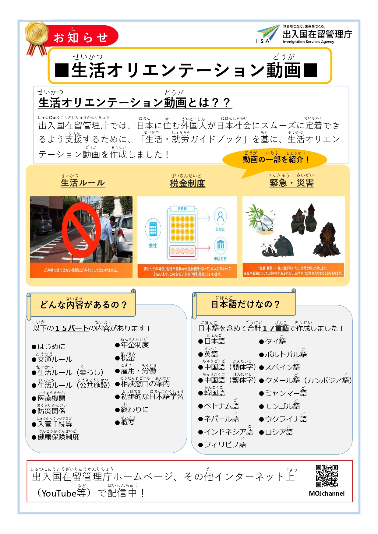 出入国在留管理庁は、日本に住む外国人が円滑に日本社会に定着できるよう支援するために生活オリエンテーション動画を作成しました。