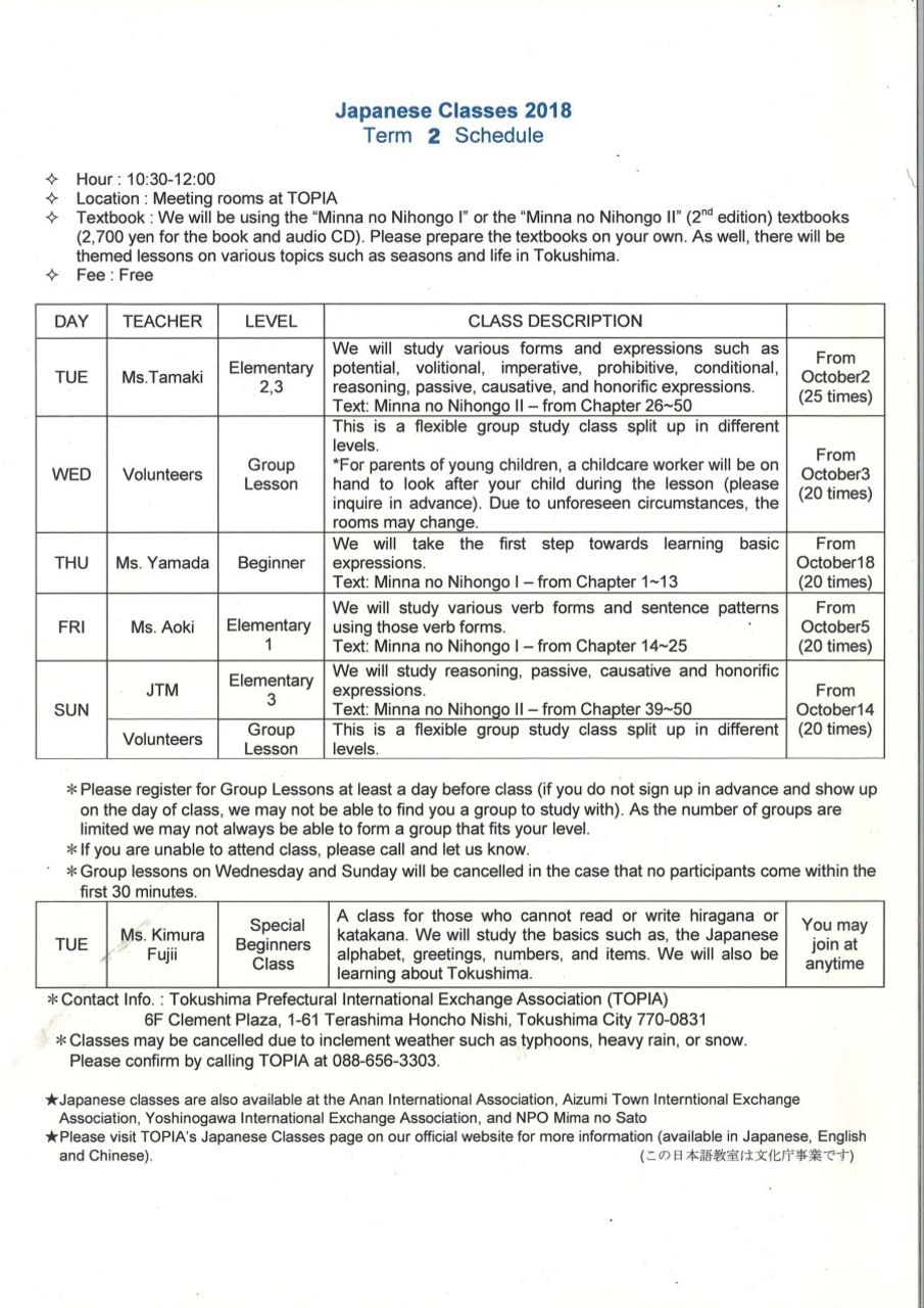 Japanese Classes 2018 Term 2 Schedule